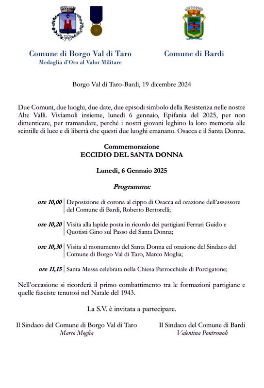 Ringrazio Roberto Bertorelli, Assessore del Comune di Bardi, un affettuoso saluto alla sindaca Valentina Pontremoli, nuovamente mamma da meno di un mese, il consigliere regionale Matteo Daffadà, gli amministratori degli altri Comuni, le Forze dell’Ordine, la Polizia Municipale, le Associazioni dei Partigiani, il Gruppo Alpini di Borgotaro, i rappresentanti delle Organizzazioni sindacali, le Associazioni del Volontariato che hanno partecipato oggi con animo commemorativo, il giornalista Luca Ponzi e la troupe della RAI, e le cittadine e cittadini che con la loro presenza hanno ricordato le vittime del Santa Donna.